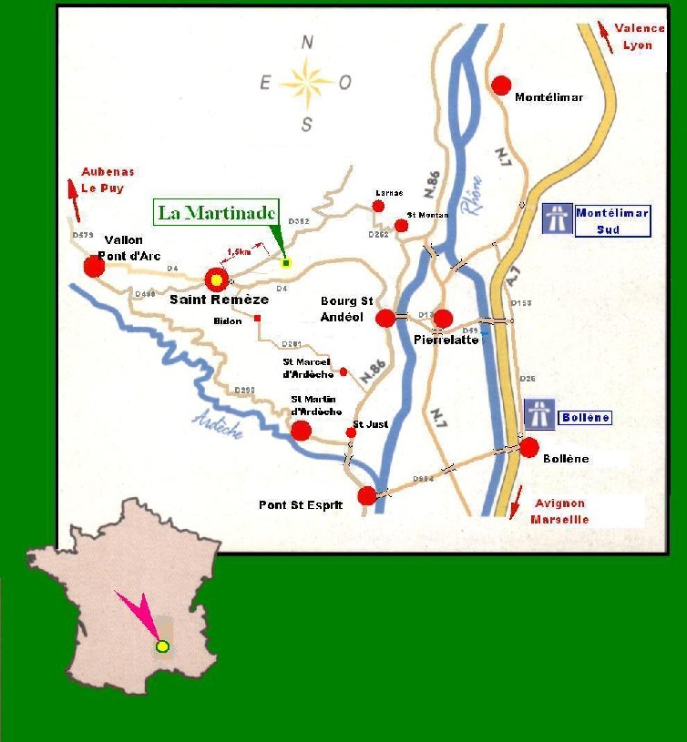 ![]() Sylvette and Gérard welcome you on their 70-acre domain in the heart of the "garrigue ardèchoise", only 8 kilometers from the famous Gorges de l'Ardèche in 4 guest rooms, each of them with central heating and a fully equipped bathroom. The ancestral farm, fully restored to modern comfort, has been home to the Mialon family for a century. For your convenience, smoking is not allowed in the rooms. If you wish it, you can have dinner with your hosts at the family table where Sylvette will treat you to hearty regional cooking for 4 persons minimum (except Sunday evening). Dinner price : - for adults, 18 Euo with wine and coffee included. - for children under 12 (same menu as adults), 12 Euro. Sorry, we don't accept pets. We have two cats at the house. Room price per night with breakfast : - 1 person, 42 Euro - 2 persons, 46 Euro - 3 persons, 61 Euro - 4 persons, 76 Euro Local tax in addition, 0.30 Euro per adult, daily or 0.15 Euro per children, daily. MANIFESTATIONS 2002 AT THE VILLAGE : *** Village festivities on the 10th of August (open-air party in an traditional local Provence, Vivais or even Occitan way. The theme of this year has not yet been fixed at the moment.) *** - It is possible to make reservations for a boattrip on the river Ardèche by canoe or kayak: the boatowner comes to pick you at your room around 9 a.m. and brings you back between 5 and 7 p.m., after you finished the trip (about 30 km) - To visit *** Museum of lavender : open from the beginning of May till the end of October. *** Ardèche Lamas : llamafarm *** Grotte de La Madeleine *** Maison de la Réserve Naturelle des Gorges de l'Ardèche *** Aven-Grotte Marzal and museum of prehistory (walk among dinosaurs in true size) - Wines ***Our village is situated in the deep south of the Ardèche, on a limestone plateau with an altitude of 350 m above seelevel. Its geographic location and 285 sunny days each year (official 2001) allow the cultivation vinyeards that result in the production of quality wines at affordable prices (AOC Côtes du Vivarais et Côteaux de l'Ardèche). *** To the Private winegrowers (Domaine du Belvezet, Domaine de La Boisserelle , Clos de l'Abbé Dubois) as well as the village cooperative "Les Chais du Vivarais" it will be a pleasure to let you taste their products. *** 16 Kilometers further, on a very pretty and small road, don't forget to stop and taste the wine from Mas d'Intras. The winegrower himself speaks English, but not the other members of the family. - Trips *** The landscape is ideal for short and longer daytrips walking by bike or on horseback (club hippique 9 km) Bed and Breakfast with dinner ** Label Gîte de France 3 épis ** 07700 Saint Remèze Tél. 04 75 98 89 42 - Fax 04 75 04 36 30 Email: SYLVETLM@aol.com |