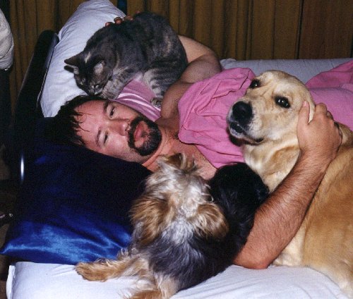 My hubby is swamped by the family's pets. Hilly is the cat, Gidget is the gorgeous blonde, and Missy is the Silky Terrier. Taken while we stayed at Mum's, just before we moved back to Canada.