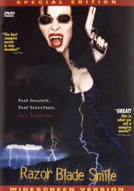 RAZOR BLADE SMILE - This darkly satiric vampire film set in the swinging, Gothic scene of London in the 1990s, arises in 1850, when the beautiful Lilith Silver (Eileen Daly) was a dynamic, headstrong woman and still traditionally "alive." During a pistol duel involving her lover and a sinister, Sir Sethane Blake, Lilith produced a pistol of her own and shot Blake. Yet, despite inflicting a wound that would have killed a mere mortal, Sir Blake just smiled. Lilith herself was then brutally gunned down. Enamored with Lilith, Sir Blake bestowed the dark gift of the vampire upon her and all eternity became her playground! Now, 150 years later, Lilith is the most outrageous and seductive woman you'll ever meet. Armed with a coffin full of weapons, she's a contract killer hired to eliminate all members of the mysterious and evil Masonic "Illuminati" sect. Besides being the ultimate guillotine maiden, Lilith in her lascivious style eludes the police who are desperate to discover her identity and end the carnage. Now that we have the basics of what the storyline is let's get into the film a bit deeper. This film is being classed as one of Britain's best genre efforts in years which really wouldn't be that hard considering I really can't stand most British films. Let me just say that if critics think that this film is good they obviously are in the wrong business. This film is C-grade all the way, the acting is crap, the story-line is average and the directing is terrible. This film is so sad that a woman in leather with her breasts showing can sneak past two bodyguards with the guards standing less than 20 feet away. Okay, so there are a few good points in the film, namely the fact that the lead woman is dressed throughout the film in tight black leather and there is also a great bloody lesbian sex scene. If you like vampire films see Blade, Interview with the Vampire or even the original Dracula but stay away from this C-grade crap.