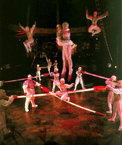 Consisting of flyers and porters, this act is performed with acrobats doing numerous jumps and somersaults in the air on these flexible apparatuses, held by porters.