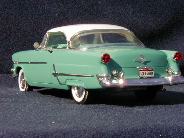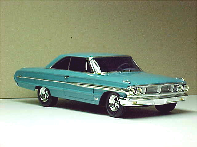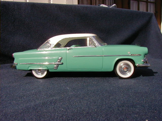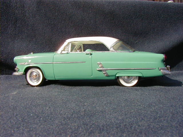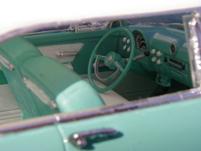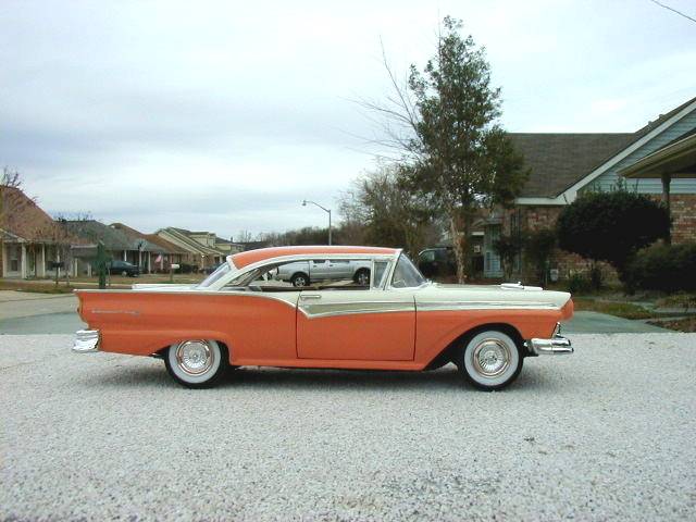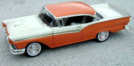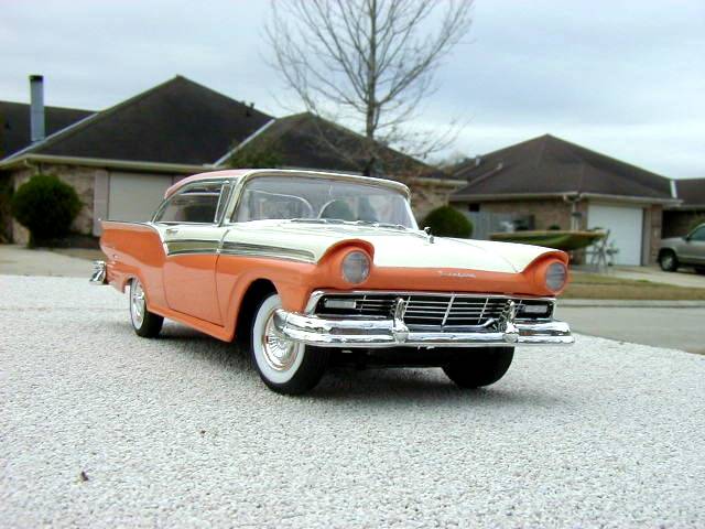 This 57 Ford Fairlane 500 was built box stock and was painted with factory correct colors of Coral Sand and Colonial White. This model was my first ever commision build. It was done for a gentleman who, as I discovered thoughout the construction, to be a wealth of knowldge on these old cars. With his input on many of the details, I was able to provide him with a replica of a vehicle his father owned and one which he has fond memories of. While this kit was not the best kit to work with, it turned out to be a fair looker.