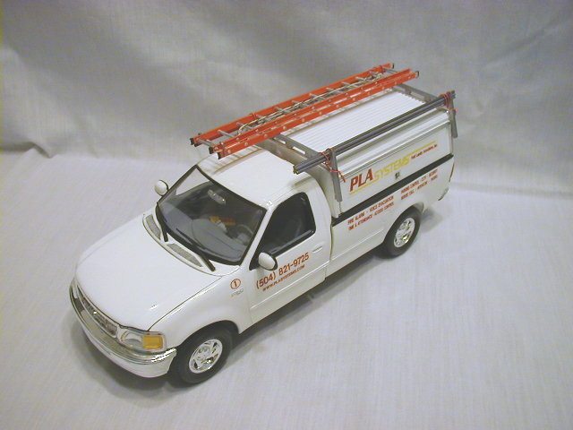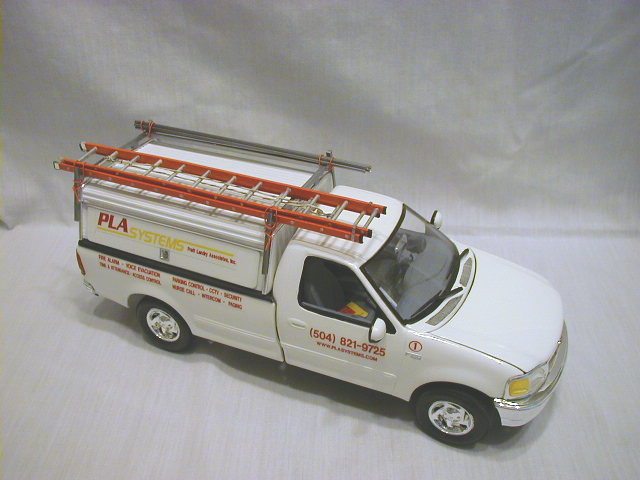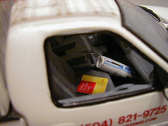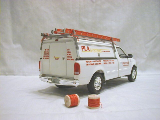 This is the second of two replica models I built of my employers work trucks. The work top shell is completely scratch built as is the ladder rack and ladder. The conduit is made from brass tubing and painted light gun metal. For some added interior detail, I included a set of drawings made from an actual cad drwaing scaled down and the NFPA 72 Code book is a photograph of that book scaled down. Just for a little extra show I made some reels of fire rated cable....FPLP as labled!