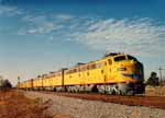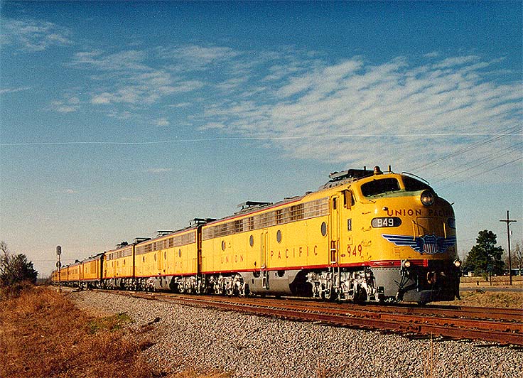 Lots of traffic runs on the UP from the Livonia yard to New Orleans. On Jan 22, 1994 the UP business train is seen here passing through the community of White Castle, LA on its way to Avondale, LA. The highway in the background is LA-1 that parallels the tracks and the river between Port Allen, all the way to Donaldsonville. The tracks eventually leave the highway around Donaldsonville as they pass through the middle of sugar cane country. Highway LA-1 also continues north all the way to Alexandria, LA. I guess you have noticed the scratch from end to end on this shot, well I had a poster print made and the negative came back like this shot - scratched. This is a prime example why you should shoot more than one image of something important. Luckily I did. (Click on image for full size view) |