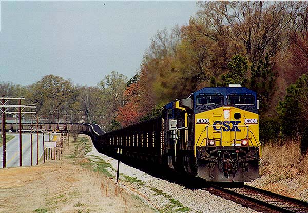 This is one of my recent favorites railroad shots that I have taken. This eastbound loaded coal train is departing Clinton, SC headed for a power plant south of Columbia. Most of these coal trains terminate next to the NS's Andrews yard in Columbia near I-77 and Shop Rd where they may be parked until the power plant needs them. Same for empties. (Click on image for full size view) |