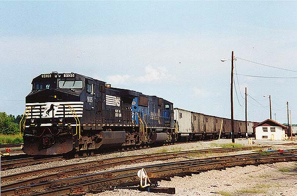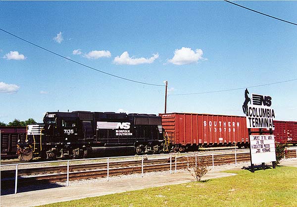 There are four routes for the NS to take out of Columbia. This train just departed Andrews yard, passed through the USC campus and is climbing upgrade on the line that goes to Charlotte, NC and points east from there. This is only the second unpainted widecab that I have photographed and the other was on Conrail in Conway, PA. (Click on image for full size view) |
