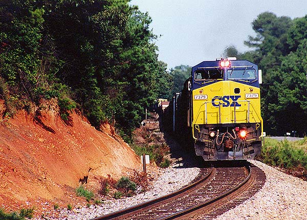 A mixed freight winds it way over the roller coster terrain near Little Mountain, SC. Red dirt cuts are ever present in this part of the state while other parts are very sandy, almost like beach sand. (Click on image for full size view) |