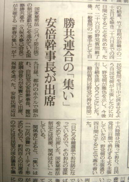 としている。 関係者によると、「集い」は「1万円会費」のパーティー形式のもので 、約400人の出席者の中には自民党の国会議員や議員秘書も目立った、 という。安倍、渡辺両氏のあいさつとも、選挙や党活動への勝共連合の「物心両面」の協力に感謝を述べただけで、国家秘密法案の扱いなどには触れなかった。しかし、自民党防衛秘密外国通報行為等防止法制定特別委の箕輪登委員長は「現在行っている議員対象の説明会に続いて、全国各地で説明会を開き、国民の理解を求めたい」と、現状を報告したという。 |