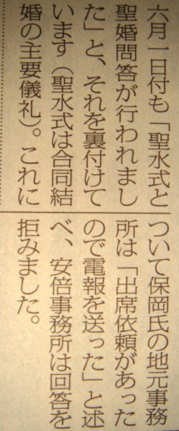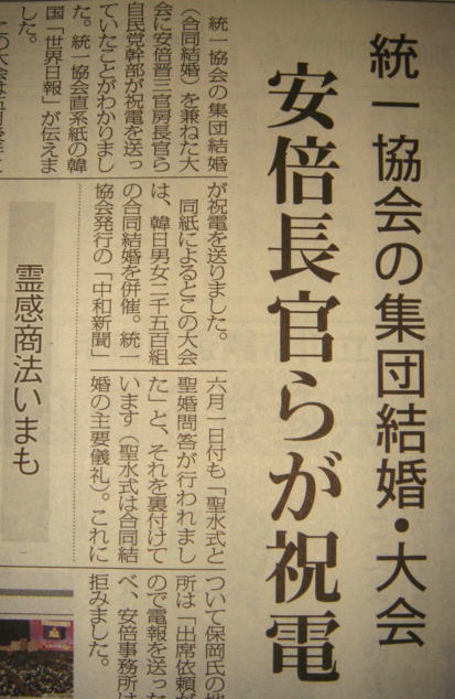統一教会の福岡大会 mms://222.122.15.167/vod/20060513j_300k.wmv (17分から祝電紹介) 内閣官房長官 衆議院議員 安倍晋三(自民、森派) 元法務大臣 衆議院議員 保岡興治(自民、山崎派) 他国会議員五名 > ありがとうございました。 >さて本日は先ほど私は5000名ともうしあげましたが、 >会場の方にお聞きしましたら7千3百名名を越える方々がお集まりでございます。 >大変なことでございます。 >更にこの席には4百名を超えるご来賓の方々がいらっしゃっておりますが、 >時間の関係上ご紹介できないことを大変恐縮に思っております。 >申し訳ございません。 >祝電がいっぱい届いておりますが、その中から数個をご紹介申し上げます。 >岸信介元総理大臣のお孫さんでいらっしゃり、現内閣官房長官副総理大臣でございますが、 >現内閣官房長官衆議院議員の安倍晋三様←ココ |