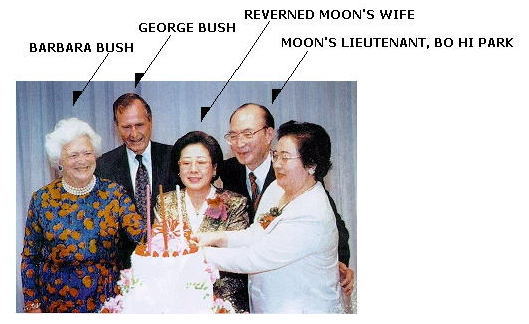ブッシュ元大統領と文鮮明の妻 ずぶずぶパーティー ![]() ブッシュ・パパは1995年9月に夫婦で来日、 文鮮明の妻が率いる「世界平和女性連合」が東京ドームで開いた大会で講演まで行っている。 翌年にもアルゼンチンを訪問、統一教会系の地元新聞の創刊パーティーでスピーチしている。 息子のブッシュ現大統領も、2002年5月に ワシントンで開かれた統一教会系ワシントン・タイムズ紙創刊20周年の集まりに メッセージを寄せている。 |