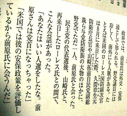 たとえば米国のローレス国防副次官は8月に来日した際、久間章生元防衛庁長官や山崎拓前自民党副総裁ら与党防衛族の大物のほかに、野党でただ一人、前原氏と会った。