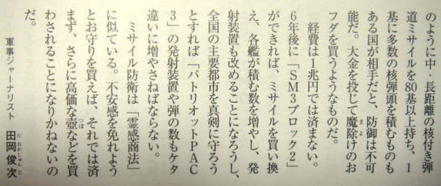朝から夜中まであらゆるマスコミを使って、国家間憎悪、民族間憎悪を煽り立て、子供だましの軍事危機を捏造し、教育、福祉、医療、必須の公共事業まで根こそぎ破壊、簒奪して、巨大利益率の詐欺兵器を際限なく産み出し続ける人殺し企業群(平成軍需財閥)でこの国を覆う「アメリカ型戦争経済体制」にシフトして行こうとしている。