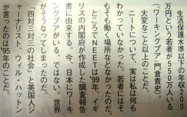 働くことがが『脱「貧困」』につながらない日本。これが日本の特異性である。「どうして日本の若者は反乱しないのか」。フランス経営大学院の日本視察団のコメントは重たい。