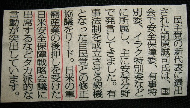 党首選挙でタカ派小僧が党首! 日米産業界の巨大軍需利権は マスコミを総動員した巧妙極まりない詐術で 自公政府と民主党という「野党」も手に入れた。 小泉純一郎に続いて前原誠司という殆どマンガのような男をでっち上げたのだ。 2005年初秋 冗談としか思えない政治状況が現出した。 |