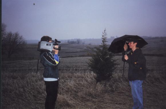 These were are very first two storm chases! We are new at this stuff, so you have to cut us some breaks. The first chase happened on April 8, 2001. The chase began by us heading south out of Ames past Des Moines to around Osceola, IA. Once there we realized that we had moved to far south of the warm front in the warm sector. We could tell because the clouds would get blown over before they could build up. Just as we realized we were too far south, thunderstorms began developing around Des Moines. We headed north on interstate 35 to the area. We found a towering cloud deck and decided to pursue it just to the south of Des Moines on highway 5. This is where we ran into KCCI. They were out chasing as well that day, thus we decided to join up with them, being our first chase and all. We headed east on highway 5 continuing to pursue the tower of clouds, but alas it was moving too fast. However, we heard more storms were developing back to the west, so we went west back to interstate 35 and went west on interstate 80. We stopped around Adair, Ia and saw an awesome lightning display, plus a monsterous wall cloud. We did see a funnel, and we called it in to the NWS. After this storm moved east, we decided to go back east as well. The same storm we had just seen the wall cloud now had moved over to Polk county and prompted a tornado warning there. At this point we decided to stop chasing due to the hail threat and nighttime. Not good to chase in the dark. This was a pretty successful chase.