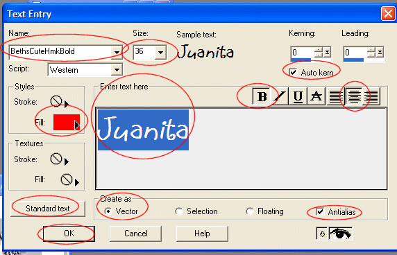 I chose "BethsCuteHmkBold font", Size=36, Auto kern checked, Bold selected, Justification on "Center", Click on Standard text box, Vector selected, Antialias checked, Click in side the "Fill box" under Styles, then choose your color. I chose red, then click ok.