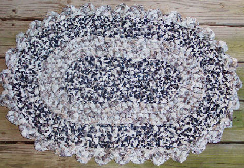 This is a standard size oval and is done in a charcoal grey/white print and coordinating charcoal/black trim.