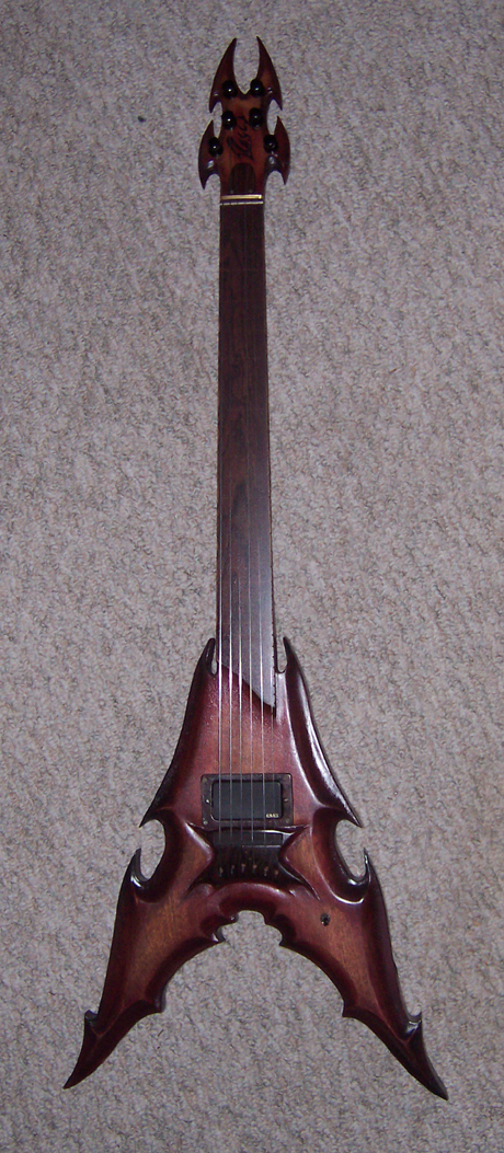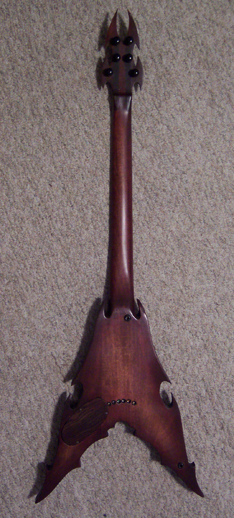 This is the first prototype of What will become my first standard model. This one is for me and it will be fretless. Mahogany neckthrough neck and body, bocote fingerboard. The standard model will have frets.