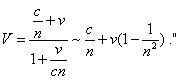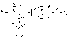 [Pauli: 12, chapter 1, item 6, p. 33- 34]. We can see that even Mandelschtam took the light velocity in a medium equal to c1 = c/n , while in this derivation only u'x but not c in the denominator has been transformed in order to account the medium! This means, the substitution was made only partially. If we transform (2) correctly, and given the light velocity varying in the medium, we will yield |