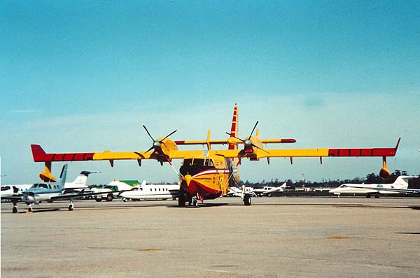 Equipped for forest fire fighting, this very large seaplane, as compared to the private plane in the foreground, can either skim over the water or land to fill onboard water tanks that are dumped over remote areas needing water to extinguish fires. The plane was photographed at New Orleans International Airport. |