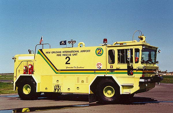Fox 2 is assigned to New Orleans International Airport (MSY) located in Kenner, Louisiana. Fox 2 is one of two Oskosh T-6 models assigned to the airport. This 4x4 has a water capacity of 1,585 gallons and carries 205 gallons of 3% foam. The airport fire department is part of the New Orleans Fire Department, but is located in Kenner, another city and different parish (county). |