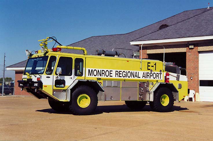 Monroe airport is not a very big one, but there are two E-One "Crash" trucks assigned to the airport firestation. E-1 is seen here on October 3, 1999. These hugh safety yellow trucks can foam down a runway in the matter of minutes. Also assigned to the station is a conventional pumper that responds to fires not related to aircraft emergencies. |