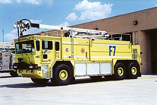 1998 Oskosh Crash truck assigned to Philadelphia International Airport is a little different than most you find. Very similiar in appearance to F6, F-7 has an articulated boom for dispensing foam from an elevated angle. |
