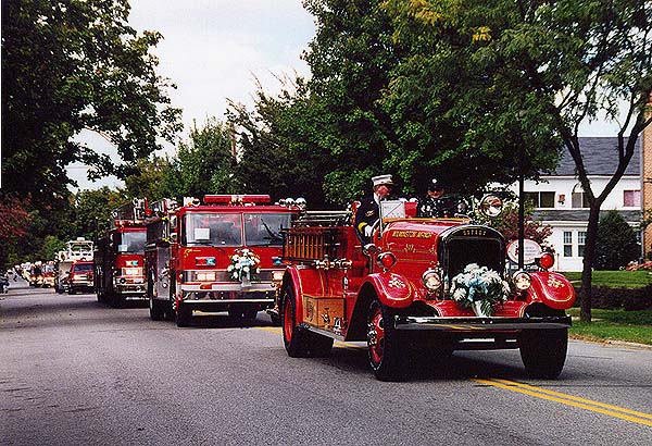 Federalsburg, Maryland is the location for this parade shot. Federalsburg's Volunteer Fire Company hosted the parade on October 8, 2000. Federalsburg's old Pierce pumper leads their rescue, newer pumper, tanker, and a very long line of various fire apparatus from neighboring Virginia and Delaware. |