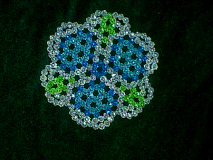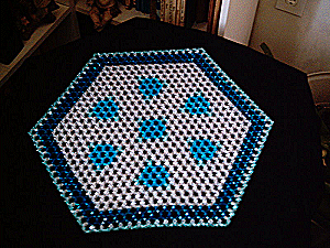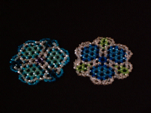 Crystal Beaded FLower Doilies. These Doilies light up any room with translucent crystal beads. The picture doesnt show up all that well due to poor lighting and resolution. The doily on the left has a light blue scalloped edging with a crystal background and light blue flowers with dark blue/green leaves and a purple center. The doily on the right has crystal edging and background with dark blue points on the light blue flowers. The leaves are a yellow/green and the center is dark blue.
