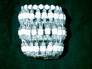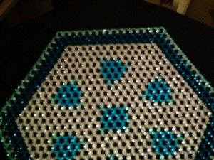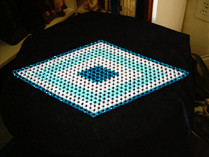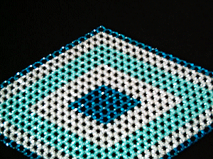 This is another of our centerpieces but its in the shape of a translucent diamond and just has different colored diamond rings. The edging is blue/green followed by a white crystal diamond shape then a light blue then another white crystal diamond and finally a blue/green diamond center. This is a smaller centerpiece than the other two but just as pretty and well detailed.
