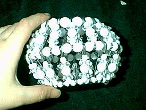 All three candle holders are scented the white are vanilla and the red is cinnamon. The two cylinder candle holders lost their shape when I laid them down but they retained it when I sat them back up again. Each candle holder is made from safety pins round faceted beads and snowflake beads.