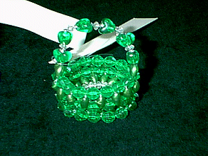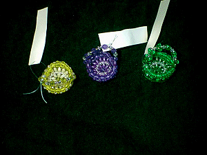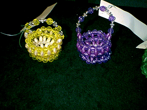 Every easter display should have a small beaded easter basket. Pictured above are three baskets made in green, yellow, and purple. The green basket is made with green facetted beads,green rice beads, white rondells, and green hearts for the handle. The purple basket is made from the same design as the yellow one. we used facetted beads,rondells,and rice beads.