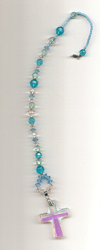 This rearview mirror Cross Suncatcher is made of blue and clear beads with an iridescent cross. Just adjust the clasp to the desired position by closing it around the beads and watch it sparkle.