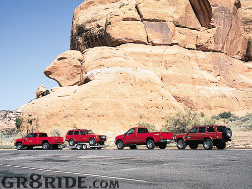In towing tests just south of Moab, our test rig turned in a respectable average 0-60 towing time of 35 seconds. While this number may seem slow compared to some trucks, it is important to remember we were pulling a load and shifting through six gears in less than a minute. A lot of the delay was just the time required to shift. We don't find this a concern since the Dodge Ram felt capable of towing twice the load and more with the same performance. The fact is, even when we had reached 60 mph, this truck was no where near the limit of its acceleration. Fuel economy while towing was good too. On our round trip from Los Angeles to Moab, we averaged 12.85 miles per gallon while towing our Cherokee on a trailer.