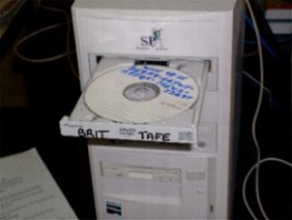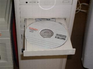 CD is inserted reflective side down into the rewriter ready to be copied onto. Care must be taken to make sure it sits cleanly within the disk slot so as not to become trapped when closed.