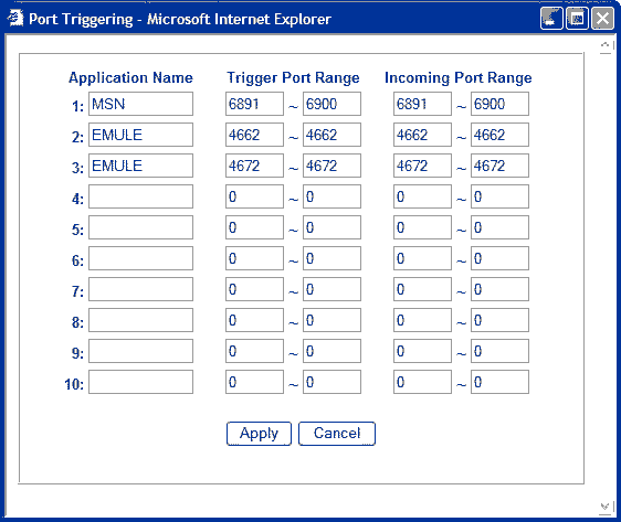 - Presiona 'Apply'.Esto debería ahora permitir a tu router dirigir los paquetes de eMule a tu máquina sin la necesidad de direcciones ip específicas permitiendo a muchas maquinas usar eMule por dhcp.