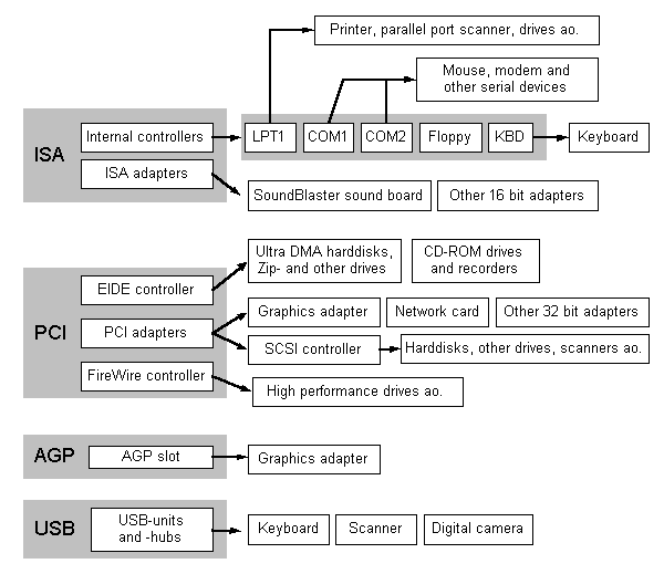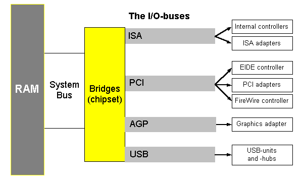 The PCI bus is the most loaded of all the buses. It is used for so many purposes that the output for the graphics adapter has been isolated on its own AGP-bus.