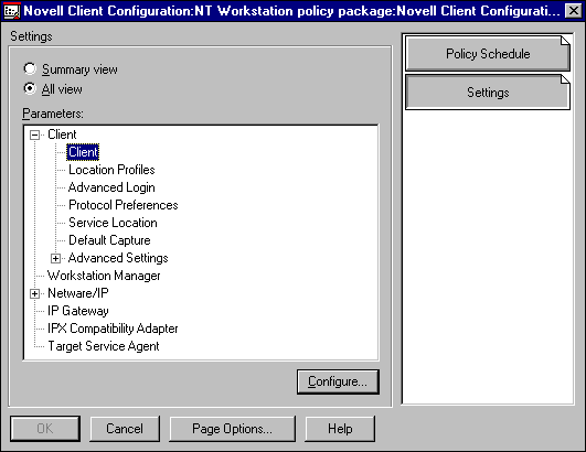 Workstation Manager includes the ability to configure the client from within the NetWare Administrator, through a Novell client configuration policy in the Workstation Package. This can effectively configure any client option remotely that the administrator could configure locally. The changes are applied with the user login, but do not become active until the next time the client reboots.