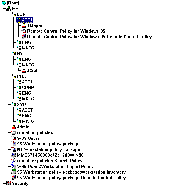 NDS provides security to an enterprise network by creating a hierarchical tree structure for all network resources to reside in (see Figure 11-1). Since all network resources reside in a single structure, they can also be managed from a single seat of administration. The NetWare Administrator program is the primary means for the single seat of administration for NetWare 5. An administrator who has access to the entire NDS tree can execute the NetWare Administrator program from any network client and manage any network resource even if that resource is located halfway around the world.