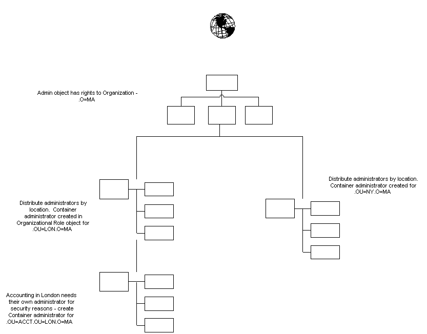 Container administrators are User objects that have been granted Supervisor rights to a container object and all the objects within that container, but not to any other container objects within the tree. Figure 11-2 illustrates this process. Using an Organizational Role object for the container administrators allows multiple container administrators to have the same rights, and it facilitates alternating administrators. For example, when creating a container administrator and the Supervisor rights are granted to the Organizational Role, the Organizational Role will have Supervisor rights to the file system of any servers within that container. In order to create a container administrator using an Organizational Role object, follow Exercise 11-1.