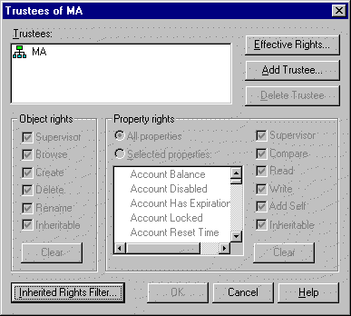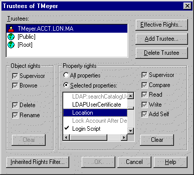 As illustrated in Figure 11-3, a trustee can be granted property rights to all properties or to selected properties. Using a selected property method for granting rights can fine-tune security. Note that in some cases, a trustee can inherit all properties rights from a parent object, and be granted explicit rights to selected properties.