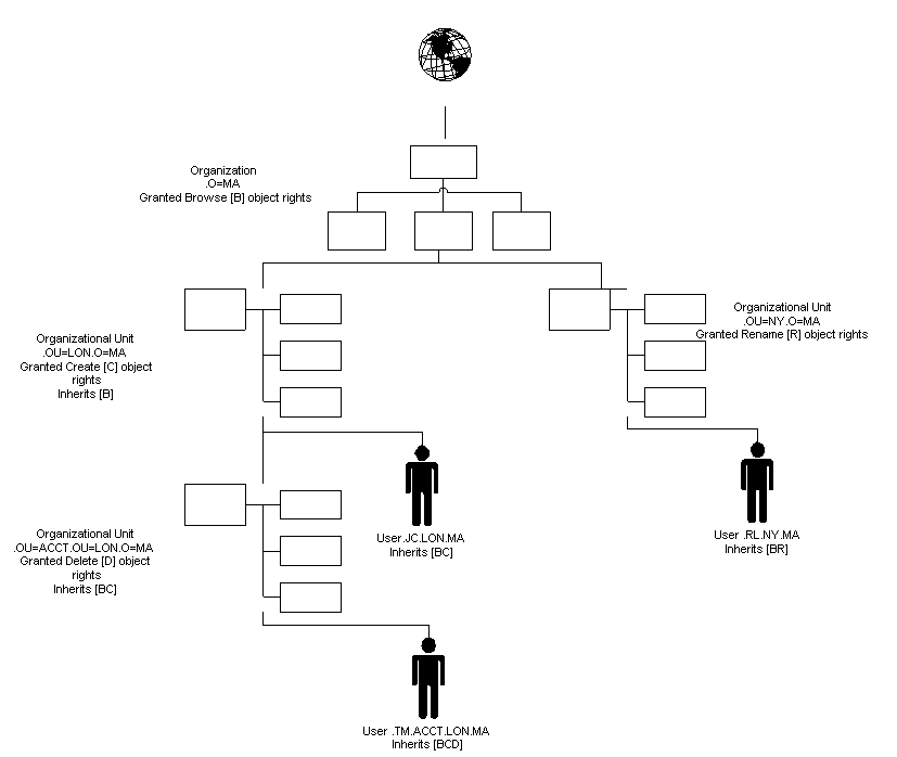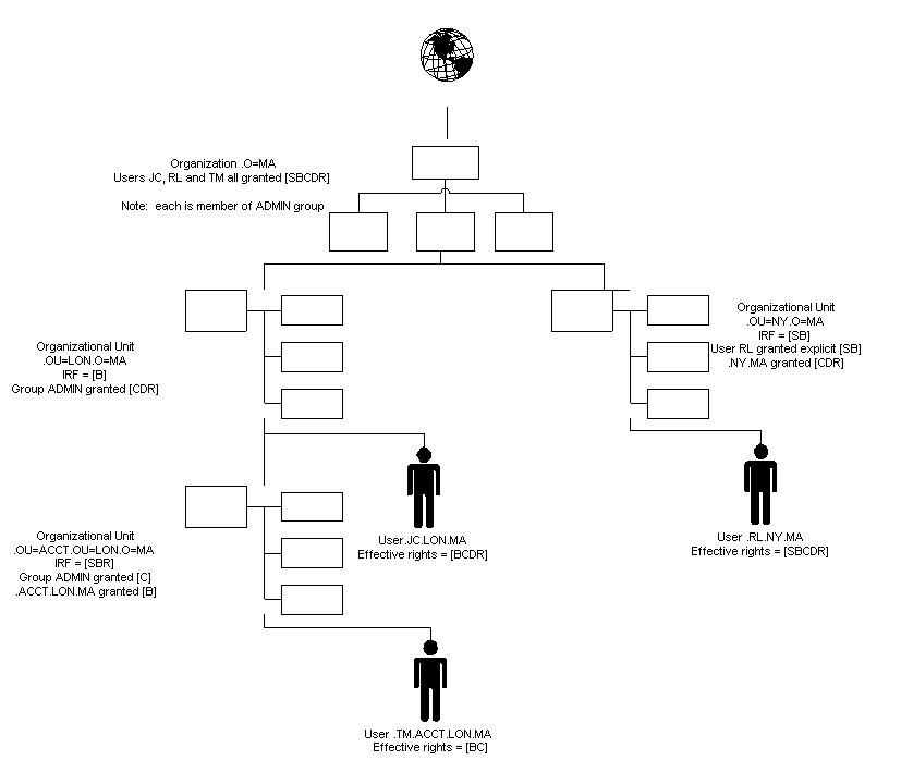 In Figure 11-9, each user has been granted identical rights at the organization level. In figuring what object rights the users have within their own contexts, the IRF will apply. The NY context IRF allows [SB] to flow down. That means that user RL’s inherited rights are [SB]. Add RL’s explicit [SB] and security equivalence [CDR] rights to obtain the effective rights of [SBCDR] within RL’s own context. User object JC will have the inherited [SBCDR] rights filtered by the IRF [B]. Add the security equivalence rights of [CDR] and no explicit rights for the effective rights of [BCDR]. For User object TM, all rights except Browse are filtered out through the .LON.MA IRF. Then the [B] rights are also allowed to be inherited through the .ACCT.LON.MA IRF. Through security equivalence, the TM user receives both [B] and [C]. The final effective rights for TM in that context are [BC].