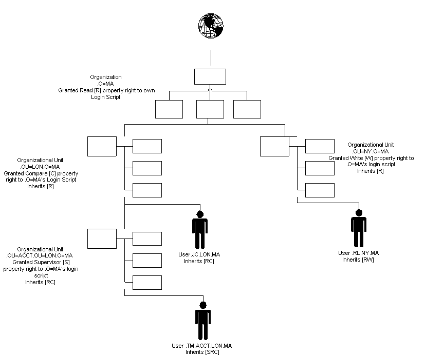 An explicit right is a trustee assignment that has been granted to an object directly. An inherited right is a trustee assignment that was granted to an upper-level object and is received by the lower-level object through the NDS flow-down relationship. Property rights can be inherited the same as object rights. Figure 11-5 demonstrates a property right inheritance using a Login Script property as an example.