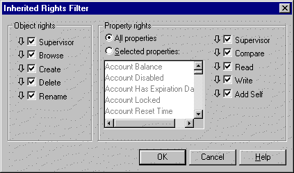 Both object rights and property rights can be filtered. The rights that this affects are those that are inherited from upper level containers. When a right is explicitly granted, even though the IRF blocks that right, the object still has that right. For example, when setting up a container administrator, you may want to filter out upper-level administrators. The container administrator would make sure to have explicit supervisor rights to the container and then set up an IRF for that container with the Supervisor rights check box cleared. Although the IRF does not allow the Supervisor right, the container administrator has an explicit trustee assignment and maintains Supervisor capabilities.
