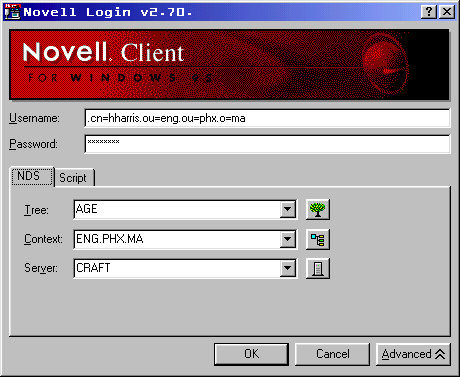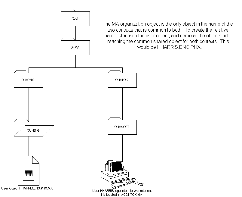 In this example, the context of the HHARRIS user is OU=ENG.OU=PHX.O=MA. The context of a workstation can be set to .OU=ACCT.OU=TOK.O=MA, and the user account’s context will still be .OU=ENG.OU=PHX.O=MA.