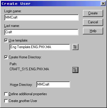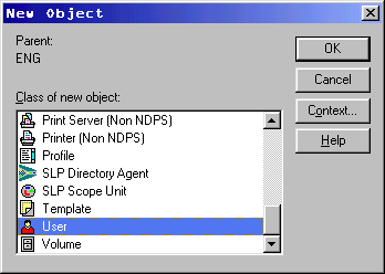 User objects can be created under any container object, except for the [Root] object of the NDS tree. The user’s context should be the same as the one at the workstation they normally log on to. For bindery logins, the workstation and server that the user is logging into should be set to the same context as the User object. The User object creation process includes the option for creating a user’s home directory. As part of the process, the User object is granted all file system rights (except Supervisor) to fully manage all files and subdirectories in the new home directory.
