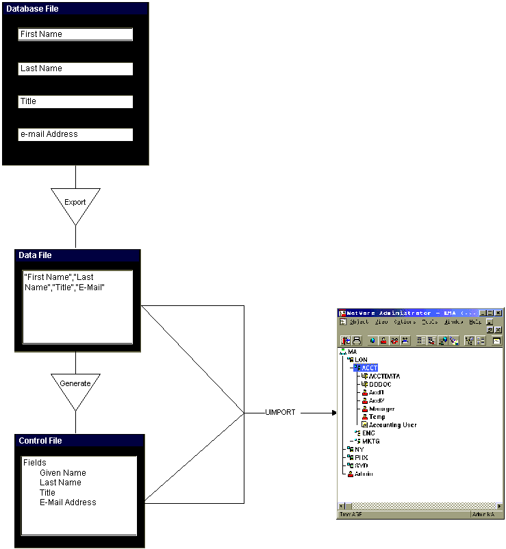 UIMPORT is a utility for migrating a large number of users from an existing database into NDS. This is particularly helpful when migrating from one operating system to NetWare 5, or when adding a large number of users to the NetWare network. An existing database can be utilized for the UIMPORT process, which consists of three stages, as illustrated in Figure 3-6: