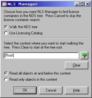 Figure 3-7 displays the NLS Manager initial screen. Licenses for NetWare and NetWare server products are stored within a license container within NDS. The first screen enables walking the NDS tree for licenses, which simply means that the NDS database is searched for license containers in all containers below the NDS container object selected.