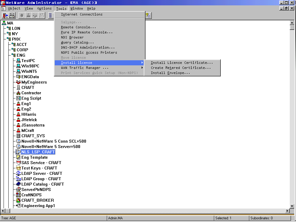 NetWare has a new licensing structure that is integrated into Novell Directory Services. Licenses are stored in a license container in the NDS tree. Licenses can be installed into the tree using the NLS Manager, or NWAdmin.