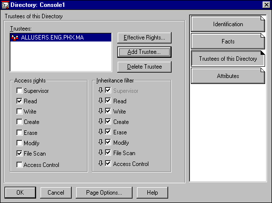 Trustee rights for files and directories are: Supervisor, Read, Write, Create, Erase, Modify, File Scan, and Access Control [SRWCEMFA]. The Supervisor right includes all other access rights. Read and File Scan are the minimum rights required to see a file and execute it. Write allows changes to be made to the file. Create allows a user to create a new file or directory. Erase enables the user to delete a file or directory. Modify allows the user to change the file attrbutes. Read allows the user to open the file. File Scan allows the user to see the files listed in a directory listing or the Explorer. Access Control enables a user to grant other NDS objects trustee rights to that file or directory.