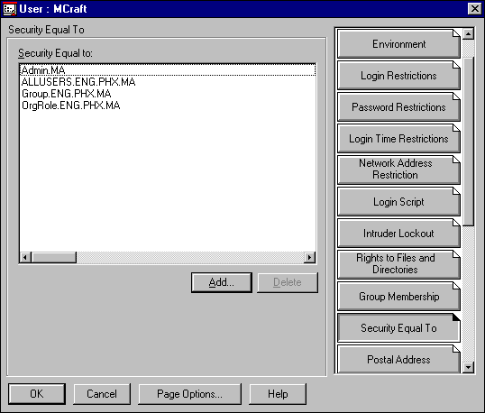 Each security equivalence is listed in the Security Equivalent To property of the User object, as illustrated in Figure 6-3.